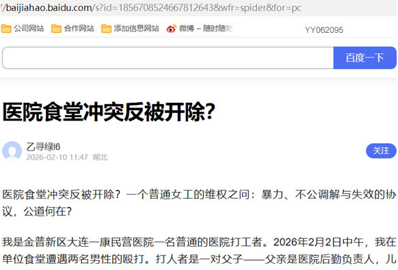 我是金普新区大连一康民营医院一名普通的医院打工者。2026年2月2日中午,我在单位食堂遭遇两名男性的殴打。打人者是一对父子——父亲是医院后勤负责人,儿子是财务人员。而如今,打人者仍在岗位,我却丢了工作,身心俱伤,维权无门。